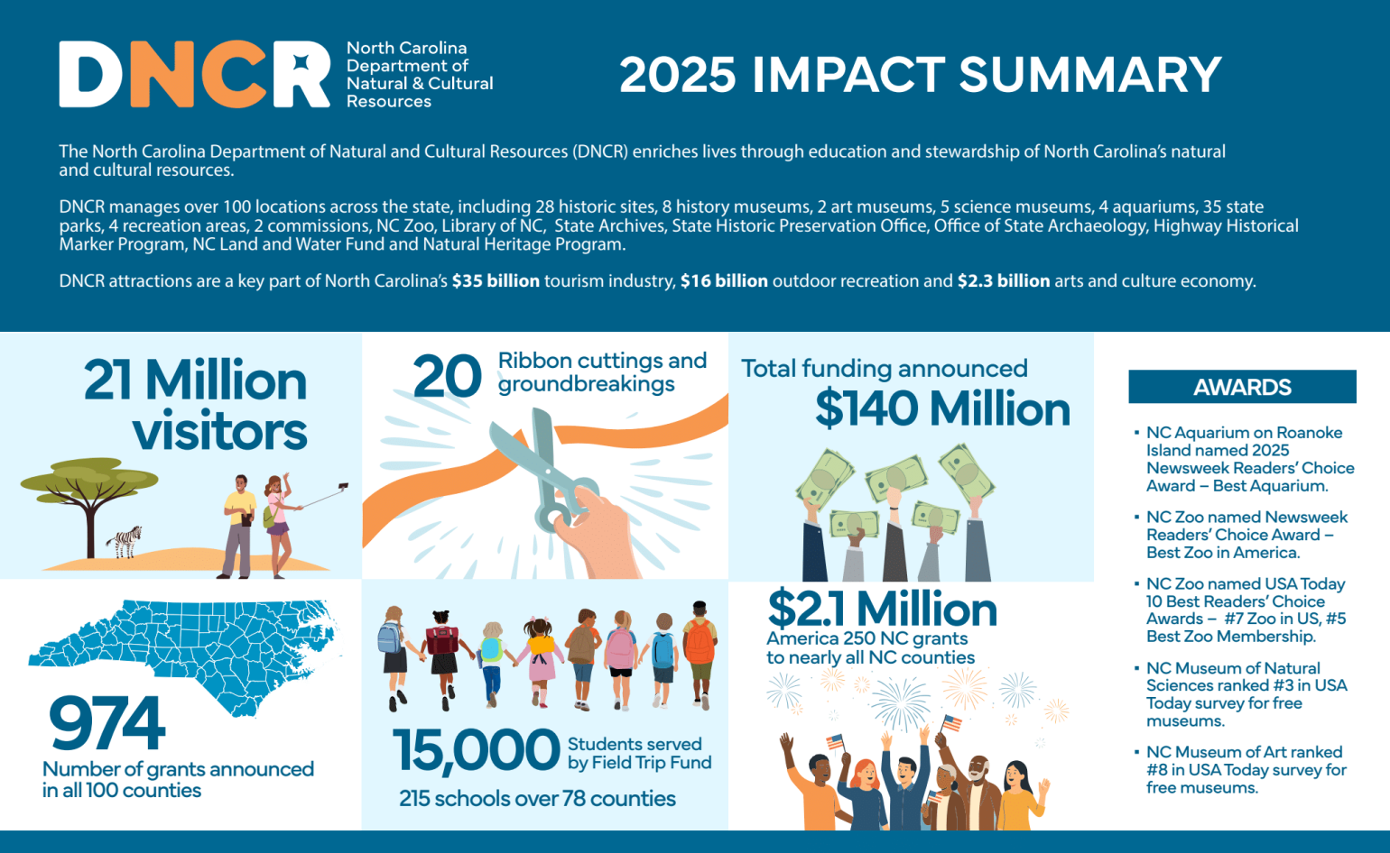 The Department of Natural and Cultural Resources is committed to strengthening the places and programs that connect people to North Carolina’s history, culture, and natural beauty. Through strategic investments and legislative support, we are improving accessibility, visitor experiences, and educational opportunities across all DNCR divisions—from historic sites and museums to parks, libraries, and arts programs. Explore the projects currently underway and see how we’re shaping the future of these important resources.