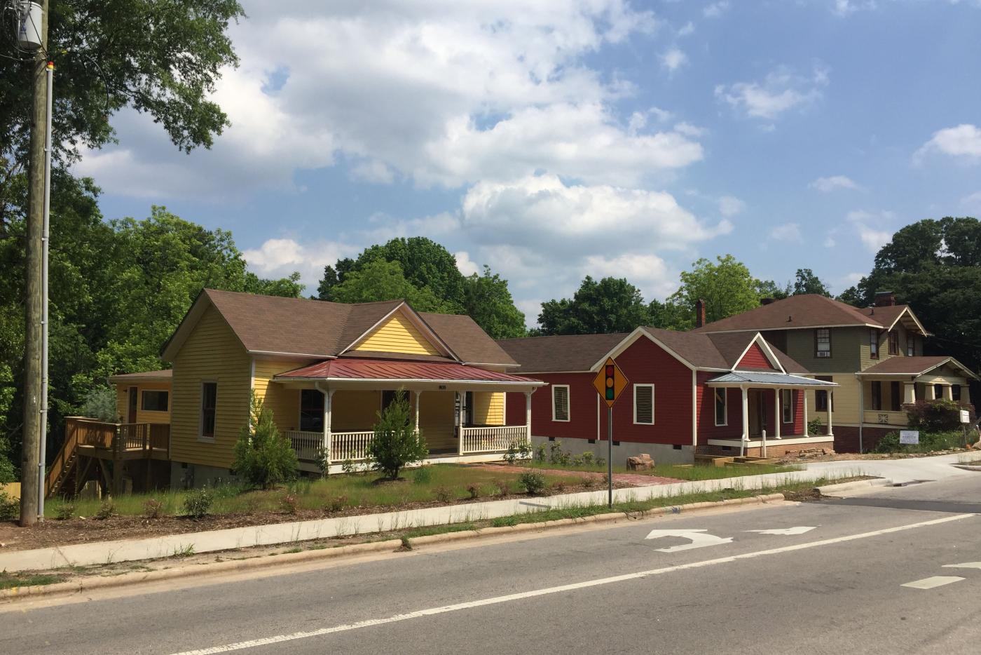 Morehead Hill Historic District, originally listed in 1985 and expanded in 2004, encompasses the larger, more stylish homes as well as the working-class homes of one of Durham’s first suburbs. The Franklin and Brame houses, both constructed ca. 1901, are one-story, triple-A-roofed frame cottages that were separated from the rest of the Morehead Hill neighborhood by construction of the Durham Freeway in the 1960s and consequently were not included in the original nomination. In March and April of 2016, both houses were moved from their original location on Yancey Street to lots on Vickers Street within the historic district. Both the Brame and Franklin dwellings are typical of the houses built for employees of the tobacco factories by independent developers that characterized much of the northern end of the neighborhood and now contribute to the Morehead Hill Historic District.